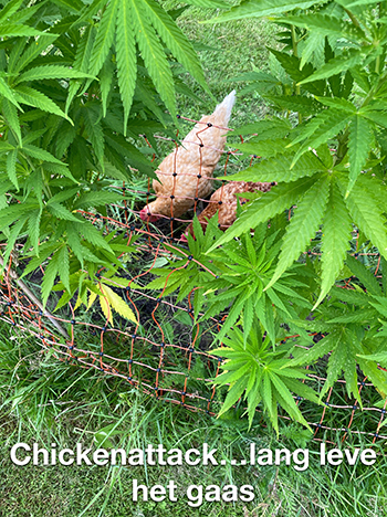 Nog steeds veel vraat bij de Dynamites en Strawnana Gum en Double Bubble vertonen wat kaliumgebrek Gelukkig staat het raster er nog omheen, want de kippen kunnen het wel heel fijn vinden onder de wiet… of de dames het ook fijn vinden? Ik weet het niet. Afijn, ik kijk uit naar een zonnige nieuwe week!