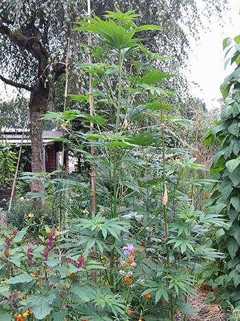 In de nacht van dinsdag op woensdag is er veel water gevallen, maar de vuurdoop was pas woensdagochtend. Ongelofelijk maar waar, staat alles nog overeind en is onbeschadigd gebleven, terwijl er bomen afbraken als luciferhoutjes! Strong girls en long girls, de planten in de volle grond gaan richting de 2,50 meter. Het weer belooft weer fantastisch te worden, dus wens ik iedereen een goed weekend.