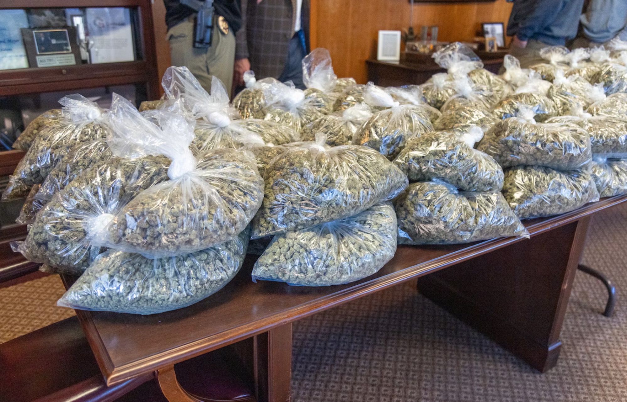 Een tafel vol met wiet, wie wil dat niet? Om te beginnen de gasten die deze foto schoten: agenten van het Gadsden Police Department. Gadsden is trouwens raar, want volgens Google ligt de stad in de staat Alabama en de gemeente in Florida. Welja, wie ook niet van een tafel met wiet is gediend, is de burger die over deze wiet klaagde bij de narcotica jongens van het politiekorps, op zondag nota bene!