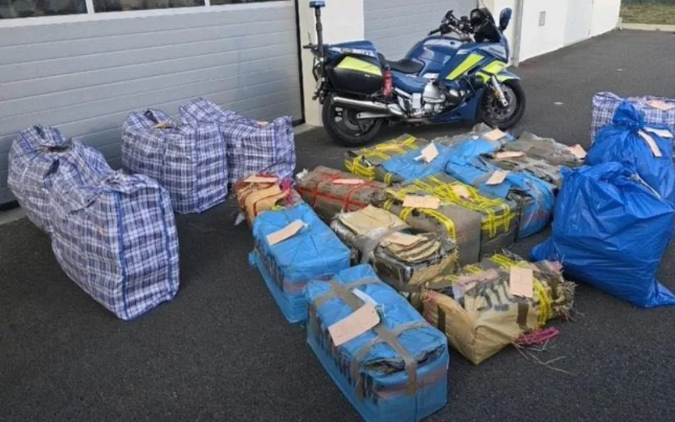 Zo, die heeft een hoop ruimte voor bagage die motor! Maar niet heus natuurlijk. De motorfiets die we bij de tassen, vuilniszakken en pakketen zien is van een actief lid van de Gendarmerie Nationale. Deze politiebrigade kiepte een vrachtauto uit Spanje leeg bij een controle op de snelweg A63 in de buurt van Landes, vorige week.