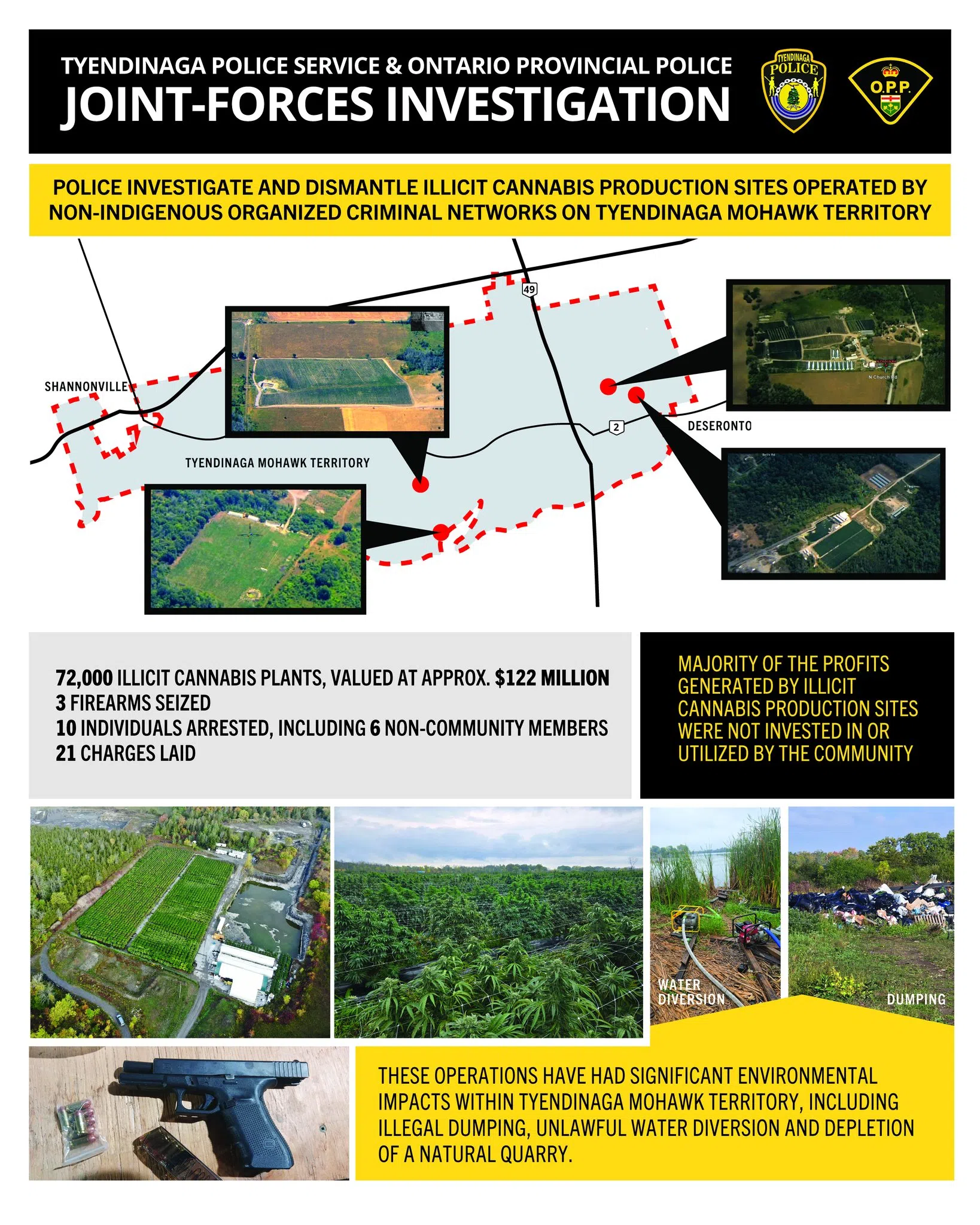 De politie van Tyendinaga en het OPP Organized Crime Enforcement Bureau startte in april van dit jaar een onderzoek naar illegale wietteelt locaties die worden beheerd door “niet-inheemse georganiseerde criminele netwerken in het Mohawk-territorium tussen Belleville en Napanee”.