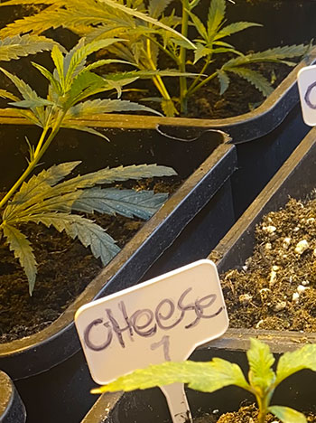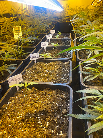 Ik heb echter wel het vermoeden dat er trips in je kweekruimte gekropen is. Ik dacht eerst namelijk wat kleine zilverkleurige vlekjes op je zaailingen te zien maar de Cheese staat wat te ver op de foto om het goed te kunnen zien. Als ik de onderste bladeren van de grotere planten echter wat beter bekijk, dan zie je dat daar allemaal kleine zilverkleurige plekjes op zitten. Check het zelf even van dichtbij. Als het geen opgedroogde kalkvlekjes van een besproeiing zijn, dan zijn het waarschijnlijk de sporen van trips.