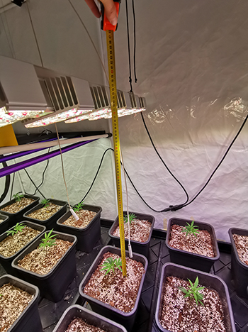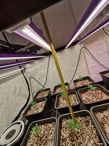 Omdat de stekken nog klein zijn en nog niet zoveel licht nodig hebben, worden de lampen volgens de aanbevelingen van de producenten opgehangen en gedimd. De Lumatek is gedimmed op 25% en hangt op 50 cm afstand. De twee SANlights zijn gedimmed op 40% en hangen op 70 cm afstand tot de top van de planten.