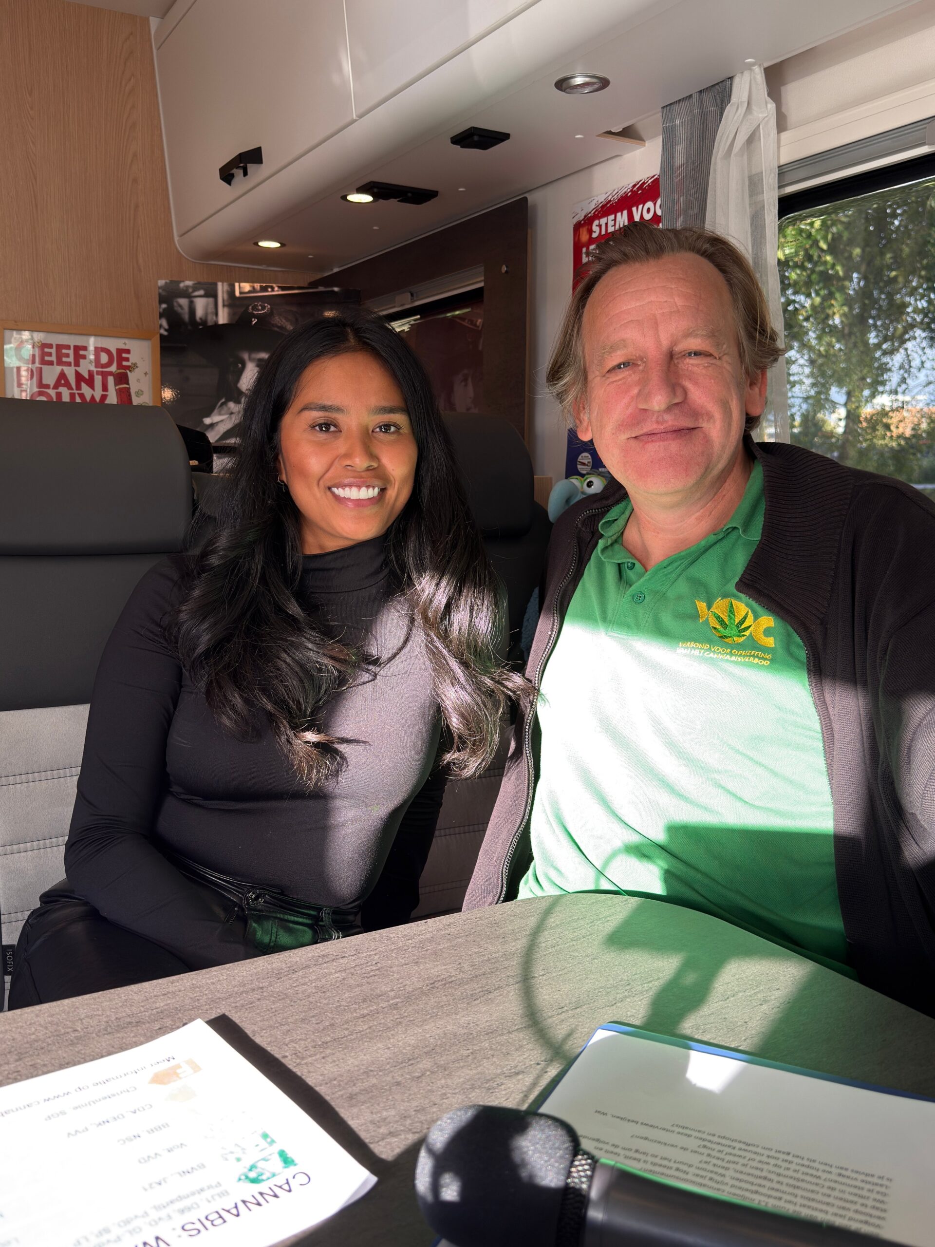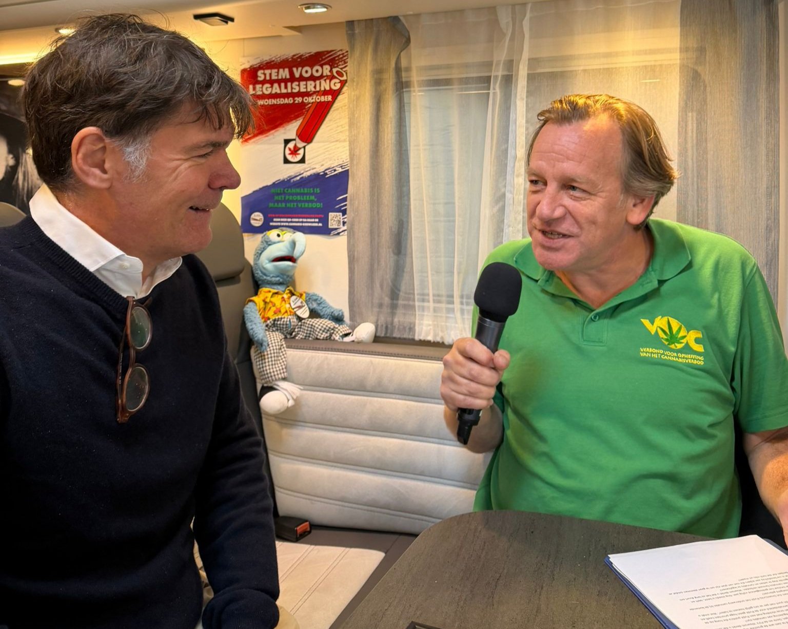 Oog TV interviewt VOC-voorzitter Derrick in de comfortabele CannaStemBus van 2025.