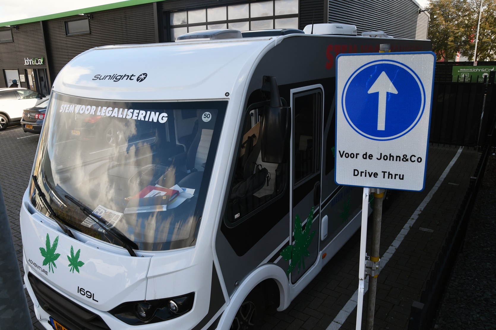 De wietbus in Hellevoetsluis bij de ‘drive thru’ van John & Co.