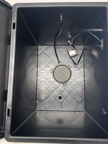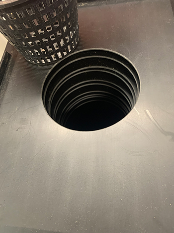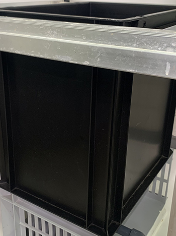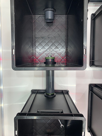 Een stukje onder de rand van de bakken heb ik een gat geboord voor de luchtslangen. Door een gat van 10 mm te boren en een kleine afdichting te monteren past de luchtslang er strak in. Om algengroei te voorkomen is het verstandig om binnen in de bak een zwarte slang te gebruiken. Een transparante slang zou het licht als een soort lichtfiber toch in het voedingswater kunnen laten schijnen.
