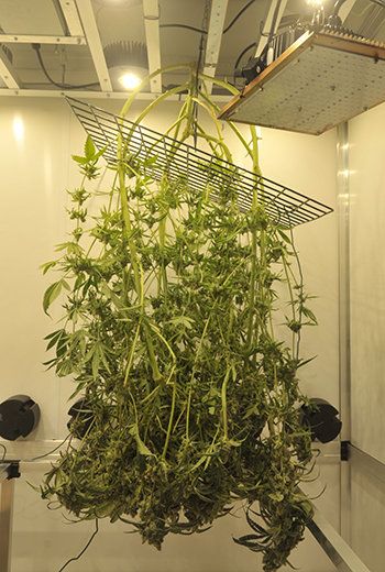 Om rustig te drogen heb ik haar in het geheel ondersteboven gehangen in een kast. De afzuiging met koolstoffilter, filtert de geurtjes uit de lucht zodat er in de buurt niks te ruiken is voor mensen die minder van wiet houden. Voor het maken van de foto stond er even wat extra licht aan, maar het drogen gebeurt verder in het donker. Nu het niet meer zo warm is hoop ik dat de nieuwe oogst lekker langzaam droogt. De vorige ronde was het binnen een week al erg droog, en daardoor wat scherper voor de keel. Ik ben benieuwd naar de citroensmaak als deze Lemon Haze straks gecured is.