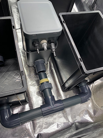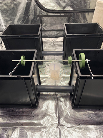 Ik heb mijn doe-het-zelf Growrilla RDWC-systeem een beetje aangepast. Ik zal je alle technische details besparen maar het zijn nu vier bakken die wat verder uit elkaar staan, met de controlepot in het midden. De deksels heb ik vervangen voor deksels met vier netpot gaten. Daar bleek licht doorheen te schijnen en daar worden wortels niet blij van… Op de deksels heb ik daarom foamtegels van de Action geplaatst. Dat was een extra klusje, maar stiekem vind ik het er ook wel gelikt uitzien 🤪