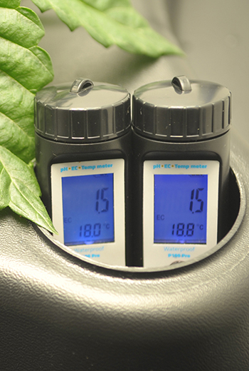 Ik probeer het water op een EC-waarde van 1,4 – 1,5 te houden. Omdat ik deze week ook 15 ml calcium-magnesium toegevoegd heb (de helft van wat op de fles staat, om de EC niet te veel te laten stijgen), verwachtte ik op gevoel op deze EC uit te komen met dezelfde hoeveelheid voeding als vorige week. Nadat ik de pH/EC-meters kalibreerde kwam de EC-waarde van het nieuwe (en ook het oude voedingswater) weer 0,2 lager uit, op 1.2. Daarom voegde ik voor 3 liter voeding toe aan 1 liter water (zodat de voeding goed oplost). Daarna was de EC wel 1.5. Nu ik wekelijks ververs is het doordeweeks lekker makkelijk, ik voeg alleen water (met de juiste pH-waarde) toe.