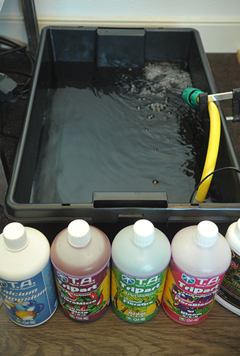 Op verschillende filmpjes heb ik kwekers flink zien roeren in het voedingswater. Nu heb ik naast de DGS een 36 liter bak met een pompje gezet. Deze pompt rond met 800 liter per uur, daar kan ik dus niet tegen roeren. In deze bak heb ik een dag voor het verversen 20 liter koud water gedaan (12 °C).