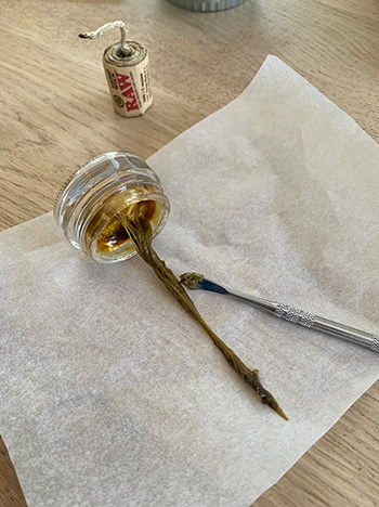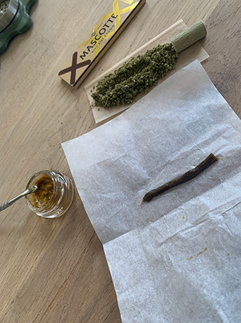 Op deze manier kon ik met een dabtool een laagje rosin over het vloeitje smeren. Uiteindelijk heb ik er nog een aansteker bij gehouden terwijl ik de joint ronddraaide. De rosin gaat dan mooi glimmen waarna het makkelijker uit te smeren is.