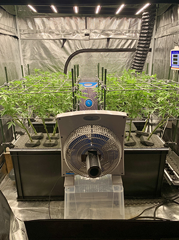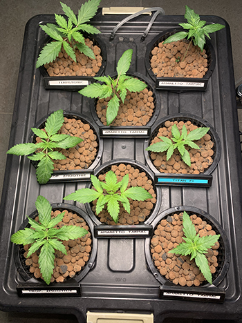 Terp & Tonic, Tropical Zmoothie en Amaretto Tarmac hebben al een paar worteltjes in het water. Naast de hydrologische kweek vind ik het super interessant om dezelfde planten op een substraat te kweken. Er staan dus ook een paar dames in root pouches (potten van textiel, red.) op een kokos mengsel met hydrokorrels (ongeveer 50/50).