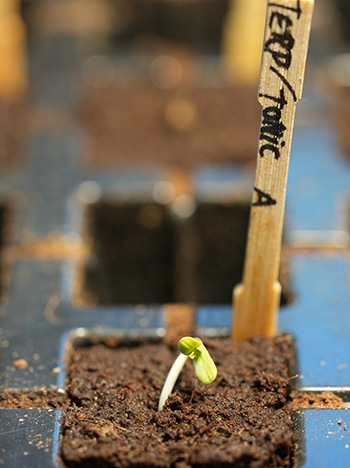 Ik heb een Eazy Plug opengesneden; het leek wel een brownie. De zaailing kon er zo zonder veel stress tussen geklemd worden. De 4 langste zaailingen staan op kokos-substraat, en de minst lange belandde in een netpot. Ik verwen dit gezellige team nog even binnen onder een quantum board (LED kweeklamp, red.). Met de schuifpui open krijgen ze in de serre alvast te maken met wind (de enige echte, van Moeder Natuur).