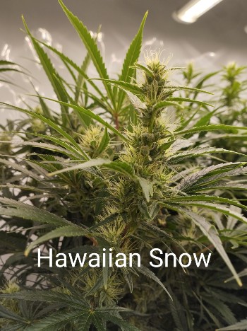 De topjes van de Hawaiian Snow zijn nog het kleinste. Dat komt omdat deze dames tot 12 weken moeten bloeien en nog maar aan het einde van week 5 van de zichtbare bloei staan. De Hawaiian Snow is tevens een kruising tussen Laos en Hawaiian Sativa, en de filmpjes zijn nog steeds op YouTube te bekijken 😁