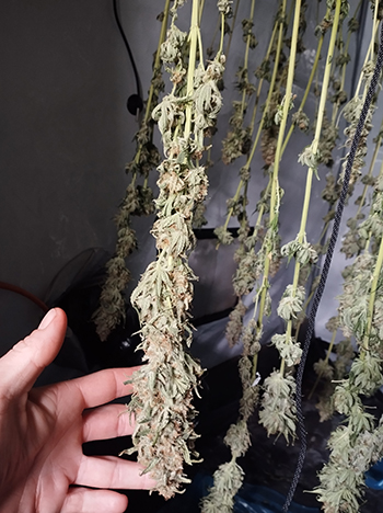 Ik heb met de hand geoogst 🙈😁 en niet met de trimmer bowl. Eerst de grote schutbladeren eraf gehaald en dan tak per tak ondersteboven gehangen. Ik laat ze zo ongeveer een weekje of soms iets langer hangen, en dan snij ik ze van de takken af en laat ik ze verder drogen op de droognetten.