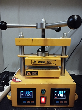 De rosin pers ik met een pers met duizend kilo drukkracht en twee verhitte platen waarvan je de temperatuur apart kunt instellen. Je kent die filmpjes misschien wel op YouTube, waarin ze met een stijltang en bakpapier een topje persen? Nou, dit is hetzelfde principe alleen dan wat groter 🙈