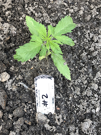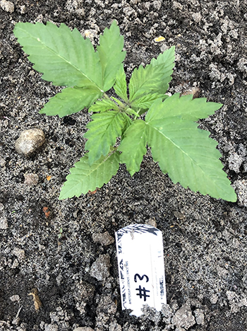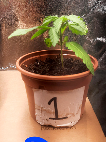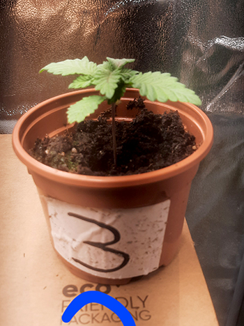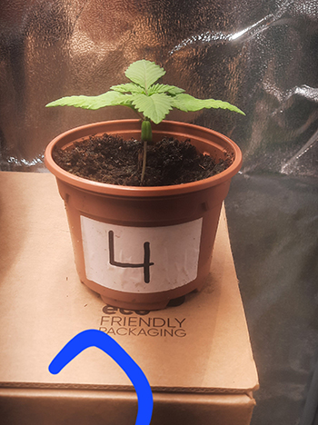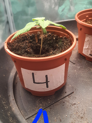 Bij nummer #4 kreeg ik zoals je in de foto kunt zien een hele aparte zaailing te zien. Voor tweederde aan elkaar gegroeide lobblaadjes, en ook na enige groei en na het verpotten blijkt dit een aparte dame. Eerst dacht ik wellicht een triploïde maar dit is het dus ook niet. De dame in kwestie lijkt normaal te groeien, echter heeft deze dame in plaats van twee tegenover elkaar groeiende vertakkingen, nu twee naast elkaar waarvan er één erg hard gaat en één niet. Wellicht een dominantie issue waar de energie naartoe gaat. Ik heb het in ieder geval nog nooit gezien.