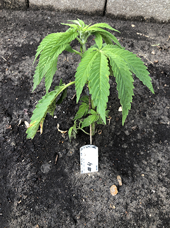 Nummer 5 is na een aantal weken nog steeds erg klein en lijkt me ook een wat minder vigoreus plantje. De andere drie dames lijken het super naar hun zin te hebben in mijn eigen opgewaardeerde aardemix, en krijgen prachtige handgrote bladeren met zeven vingers vanaf de vierde node. Ze hebben een mooie diepgroene kleur echter wat bruine puntjes door wat storm die we gehad hebben. Maar ja dit is een outdoor grow en je hebt toch altijd te maken met wat moeder natuur je voor je kiezen geeft …iets met roeien en riemen 😉