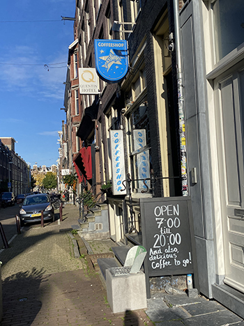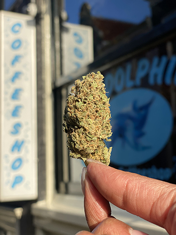 is de perfecte gelegenheid om met vrouwlief de trein te pakken naar onze hoofdstad, die in coronatijd heerlijk rustig bleek. Rond de Nieuwendijk en het Damrak scoren we de nodige nieuwe broeken en een dikke jas voor komende winter. Eigenlijk komen we vooral voor de ‘derde helft’, oftewel om wat heerlijke wiet en hasj te scoren. We zijn namelijk op weg naar coffeeshop The Dolphins, vlak bij het Leidseplein.