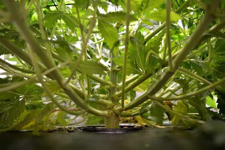 Het Flow Hydroponics Systeem is niet speciaal voor één wietplant gemaakt maar sjongejonge wat past mijn Sneeze mooi in de kast nu zeg! Vanaf de bodem van de CNNBS G-Kit tot aan de bovenkant van het bladerdek is de plant inclusief de waterbak nog geen 35 centimeter hoog. Waarschijnlijk zal ze nog wel wat gaan strekken maar normaal gesproken is een zaailing in een 12-literpot ook al zo’n 30 centimeter hoog.