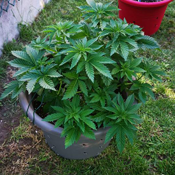 THC Bunker Buster staat op dit ogenblik in een 29-literpot. Ze is voorgegroeid in een 25-centiliter cup/beker, toen in week 4 overgepot naar een 4-literpot. In week 6 was ze al zoveel gegroeid dat ze in een 29-literpot kon. Vanaf dan zijn we ook begonnen met trainen, en het resultaat mag er al wezen: de plant is 90 centimeter hoog en heeft op het breedste punt een dimeter van 1 meter 20.