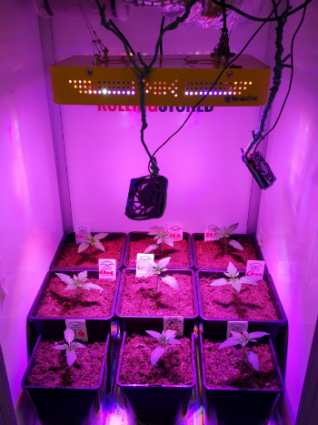 Vooraan in de kast zie je dat er drie planten in iets kleinere potten staan. Dit komt niet omdat ik geen geld meer had voor nog drie 7-literpotten, maar omdat anders de deurtjes van de RollingStoned kast nét niet meer dicht konden. Deze drie staan daarom in iets kleinere potten, ik geloof dat het 5-literpotten zijn, maar zeker weten doe ik het niet.