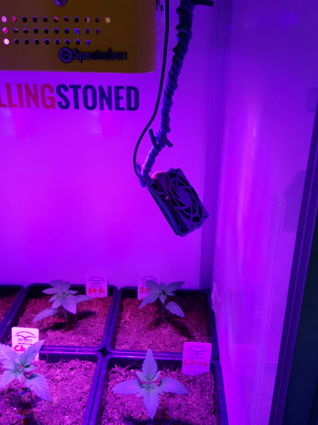 Vaste lezers weten dat ik de vorige ronde met verschillende USB ventilators heb geëxperimenteerd. Ik gebruikte daarvoor steeds van die bureauventilators die je bij de Blokker kunt kopen, maar deze gingen al snel kapot. Kennelijk zijn dit soort fans niet gemaakt om de hele dag aan te staan. Omdat ik toch iets van luchtcirculatie in de kast wilde hebben, heb ik nu twee computerventilators opgehangen. Computers staan ook dagen achtereenvolgens aan, dus ik verwacht dat deze waaiertjes het wat langer vol zullen houden. Ze zijn maar klein, maar produceren toch net genoeg wind om de plantjes zachtjes te laten bewegen.