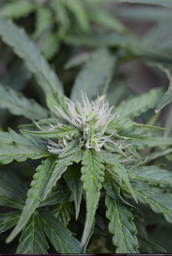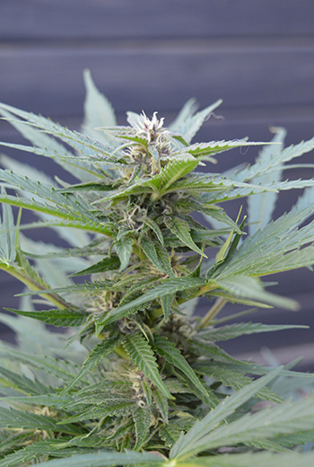 Met haar lange 7-vingerige bladeren lijkt Autoflower #4 het ook goed naar haar zin te hebben. De topvorming verloopt prima en de witte bloeiharen steken mooi af tegen het groen. Al beperkt de bloei zich hier wel een beetje tot de bovenkant van de plant. Autoflower #4 heeft wat smallere bladvingers, waardoor ik inschat dat ze wat meer sativa genen in zich heeft dan de rest.