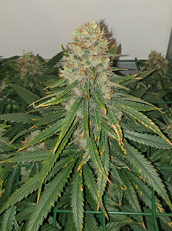 In de eerste instantie dacht ik dat ie gebleekt was door het licht van de G-Bars 150 Watt. Ik was duidelijk niet scherp want dan zouden de andere twee toppen er ook last van moeten hebben. Die groeien namelijk op dezelfde hoogte.