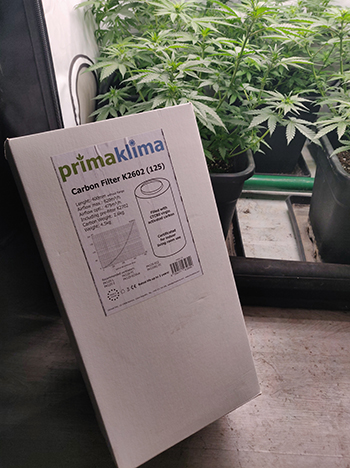 Het klimaat in de tent is de afgelopen tijd perfect onder controle gebleven, met een gemiddelde luchtvochtigheid van 65 procent, een dagtemperatuur van 26 graden en een nachttemperatuur van 21 tot 22 graden. Perfect voor een groeiende wietplant maar de bloei laat zich zien, en voor een bloeiende plant is dit veel te nat. Daarom hebben we de luchtbevochtiger plaats laten maken voor een ONTvochtiger, en hebben we de luchtvochtigheid geleidelijk omlaag gebracht naar 40 procent. Vervolgens hebben we ook een nieuw koolstoffilter van Prima Klima geplaatst, want het begint hier inmiddels behoorlijk naar aardbeien te ruiken 😉