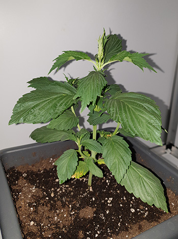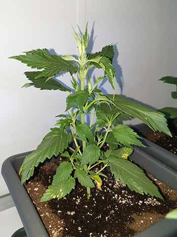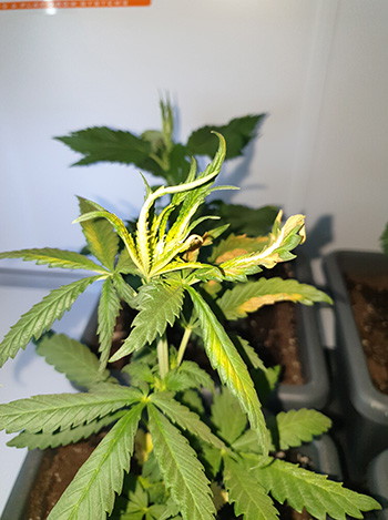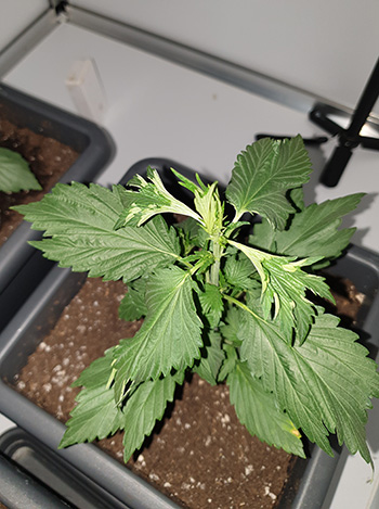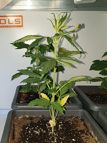 De Critical Orange Punch is de dame die iets te dicht bij het licht is gekomen, hierboven zie je de schade. Gelukkig zijn alleen de bladpunten wat verbrand. De bovenzijde van de plant is nog in goede staat. Het lukte me alleen niet om het goed op de foto te krijgen. De plant heeft een lengte van 27 centimeter en is daarmee de grootste van de vier. Van de Frisian Ducks is de grootste op het moment 24 centimeters hoog. Haar Duckfoot-bladeren zijn nu goed zichtbaar en voelen wat zachter aan dan het blad van de Critical Orange Punch.