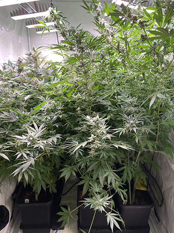 De Runtz-Ghosttrain van Rare Dankness is op dit moment mijn mooiste plant, omdat ze de hoofdtoppen vol zitten met heel veel roze bloeiharen. Het ziet er nu geweldig uit maar helaas verdwijnt die kleur later weer als de planten verder afrijpen. De geur is druif-achtig en dat komt zeker van de Runtz. Ze geeft ook een vleugje Haze-aroma van de Ghosttrain af.