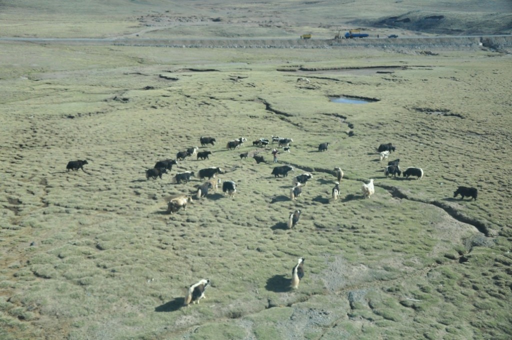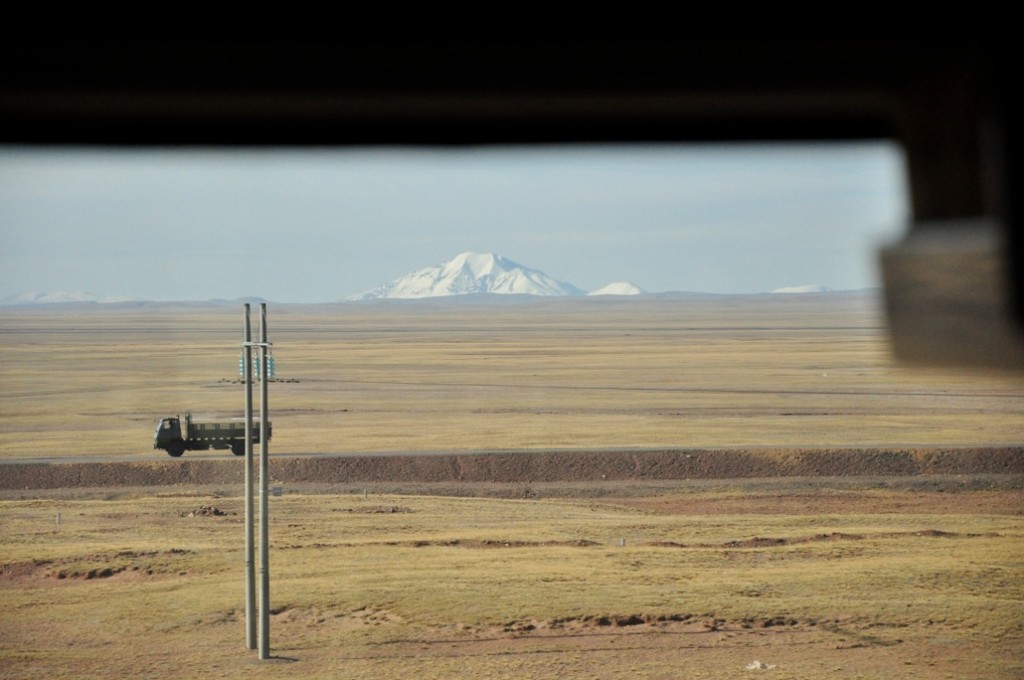 Het wordt ondertussen langzaam donker. We kunnen nog net de overgang zien van de groene toppen naar de besneeuwde bergen. We rijden over een soort grasbegroeide hoogvlakte zonder bomen en de sneeuw komt steeds dichterbij. En daarmee ook een spannende nacht voor Fenske. Morgen worden we wakker op “het dak van de wereld” zoals men dat noemt. Fantastisch mooi natuurlijk, maar Fenske vreest de hoge afgronden. Ik denk dat het allemaal wel mee zal vallen. We zijn immers al een paar zeer hoge afgronden gepasseerd en daar heeft ze zich vrij rustig bij gehouden. Deze tocht leidt ons over het hoogste spoortraject ter wereld. Op het hoogtepunt gaan er zelfs zuurstofkraantjes aan omdat het anders te heftig is voor veel mensen. Als het goed is komt er hiervoor speciaal een dokter aan boord. Ik ben heel benieuwd wat er nog voor toestanden gaan gebeuren tijdens deze rit.