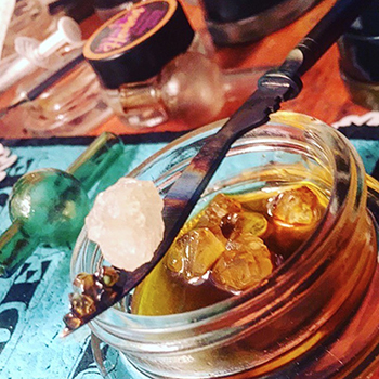 3: Hierna doe je het concentraat, terwijl het nog zeer plakkerig en enigszins vloeibaar is, in een afgesloten glazen potje. Dit potje bewaar je bij een temperatuur boven kamertemperatuur, zodat de THCA-kristallen kunnen vormen. Dat duurt twee tot drie weken, en in principe net zolang tot je tevreden bent over de gevormde kristallen. In essentie laat je het butaan op deze manier héél langzaam uitdampen.