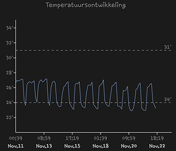 De 315 Watt CMH hangt op het moment op 22 centimeter boven de hoogste Mohammed. Deze week was de eerste volle week van het 12/12 lichtschema (12 uur aan en 12 uur uit). De grafieken worden steeds iets langer. Het lukt me niet om in de app een korte tijd weer te geven. Zo is het verloop dan weer wel beter te zien.
