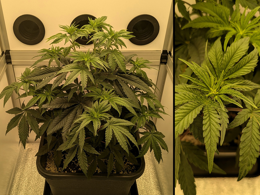 De eerste dagen moest het plantje even wennen aan haar nieuwe omgeving, maar al snel begon ze weer lekker door te groeien. Nieuwe groei en een mooie, gezonde kleur. Wat me opviel, was dat de bladeren hier en daar wat opkrulden – iets om in de gaten te houden. Meestal is dit een teken van hittestress – ook wel cupping. Dus besloot ik de lamp iets hoger te hangen en de afzuiging wat harder te laten draaien.
