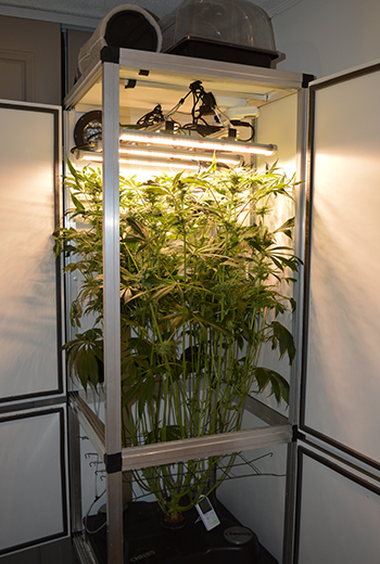 Nou, Do Si Dos is eindelijk gestopt met groeien. Op het nippertje welteverstaan want ze past nog maar net in de kast. Met het koolstoffilter aan de buitenkant van de kast, en de lamp zo hoog als mogelijk, heeft ze nog maar enkele centimeters over. Trichomen zijn al rijkelijk aanwezig en de plant ruikt erg sterk en lekker. Nou, eerst maar eens kijken hoe ze er nu bij staat, na de vierde week van de zichtbare bloei.