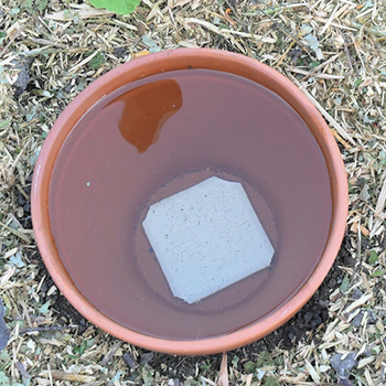Als je een terracotta pot als olla wil gebruiken, dan is het belangrijk om het gat in de bodem te dichten. Als het water meteen wegloopt heb je er immers ook weinig aan. Met wat waterdichte kit lijm je dus een plat steentje of een scherf van terracotta over het gat. Of zoals op de foto, een oude badkamer tegel. Als de kit droog is kun je de pot tot aan de nek ingraven, vullen met water en afdekken met een schotel.