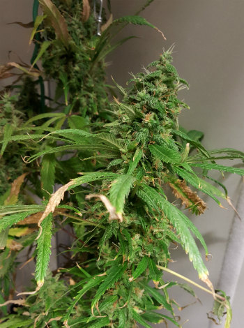 De laatste keer dat ik over mijn twee Silver Star Haze planten schreef, hingen de toppen door hun gewicht al ver naar beneden. Ik heb ze toen ondersteund met wat kettingen en binddraad zodat ze verder rustig konden afbloeien. Omdat het voor mijn gevoel niet erg lang meer zou duren, heb ik ze ook geen voeding meer gegeven. Ze hebben dus al twee weken niets dan schoon water gehad. Maar oogsten, dat doe ik nog niet, er zitten namelijk nog veel spierwitte bloeiharen aan de toppen.