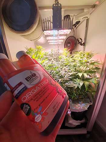 Hoewel de compost waarin mijn Hollands Hope en OE Kush groeien erg vruchtbaar is, begonnen met name de Hollands Hope planten ondertussen een beetje lichter van kleur te worden. Misschien ligt dat aan het feit dat deze wietsoort eigenlijk een typische buitenwietsoort is, maar ik ben toch maar wat regelmatiger gaan bijvoeren. Aangezien ik deze keer met de voeding uit het BioTabs startpakket kweek, geef ik de wietplanten Orgatrex te drinken. Dat is een gecertificeerde organische groei- en bloeistimulator.