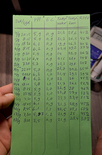 Omdat Jack en Chris beiden goede DWC kwekers zijn, heb ik hun ook om raad gevraagd. En hoewel zij me niet precies konden vertellen wat het probleem precies is, konden ze wel bevestigen dat er met mijn waardes niet zoveel mis is. Met waardes bedoel ik de temperatuur (zowel in de kast als van het water), de pH-waarde en de EC-waarde van het water, en de luchtvochtigheid. Van Jack leerde ik dat pH-min en pH-plus niet goed samengaan, en omdat ik deze wel samen had gebruikt, heb ik wederom opnieuw voedingswater aangemaakt.
