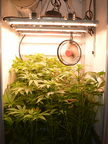 Na het knippen heb ik de ventilator van de lamp afgehaald en helemaal achter in de hoek van de kast geplaatst, zodat de 150 Watt G-Bars kweeklamp wat lager kon. Die hangt nu zo’n 5 centimeter boven de hoogste toppen.