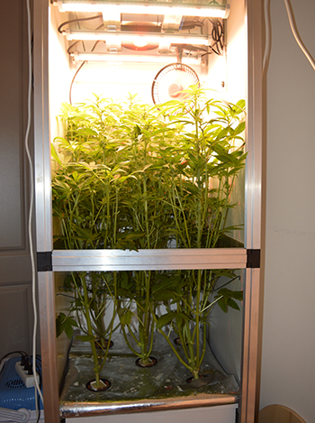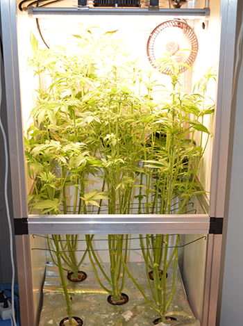 Om te beginnen heb ik dat niet ververst sinds de laatste kweekupdate. Wel voeg ik dagelijks ongeveer drie liter water toe, want zoveel drinken de planten ongeveer per dag. Daarbij gebruik ik de bloei-mengverhouding zoals die achterop de drie flessen van de General Hydroponics Flora voedingslijn staat. Langzaam krijgen de planten dus steeds meer bloeivoeding. De pH-waarde is zeer stabiel en houd ik zoveel mogelijk op 5,8. De EC-waarde is met 2,5 wel erg aan de hoge kant maar de planten lijken daar totaal geen moeite mee te hebben.
