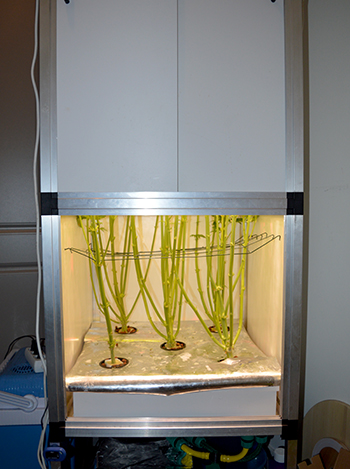 Je ziet het, de eerste bescheiden topjes zijn een feit. Maar de dames zijn vooral weer veel groter geworden. Twee weken geleden zei ik nog dat ik hoopte dat ze boven de luchtgaten uit zouden komen en inmiddels zijn ze daar al ruim 40 centimeter voorbij! Je ziet verder dat de kast ook aan de onderkant flink volgegroeid is, en dat de stammen inmiddels veel dikker zijn dan mijn vinger.