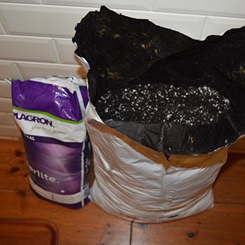 Ik heb vierkante potten met een inhoud van 3,5 liter gescoord maar helaas passen er daarvan net geen 16 in de kast. De potten zijn 15 bij 15 centimeter maar aangezien de kast aan de binnenkant net geen 60 bij 60 centimeter is, zal ik zeven van de zestien planten in iets kleinere potten moeten zetten. Ik heb meteen ook een zak bemeste aarde en perliet meegenomen, want ik zal deze keer niet op compost kweken. Hoewel ik er zeer goede resultaten mee heb gehaald, had ik ook steeds last van varenrouwmuggen en daar had ik deze keer effe geen strek in.
