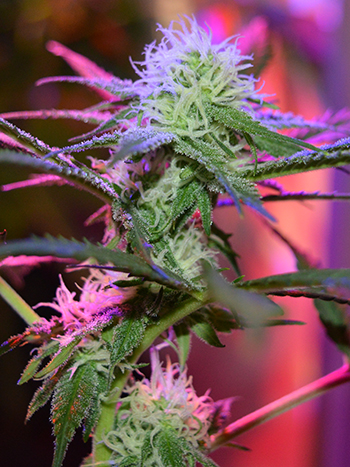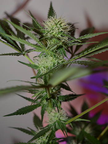 De Zkittle toppen zijn dan ook sterker beginnen te ruiken nu, de aromatische stoffen bevinden zich immers ook in de trichomen dus dat is niet zo gek. Er komt een lekkere zoete en kruidige geur vanaf die eigenlijk ook best aan snoepjes doet denken. Ze hebben spierwitte dikke bloeiharen die oplichten in het kleurige licht van de Hans Panel led kweeklamp van mijn CNNBS kweekkast.