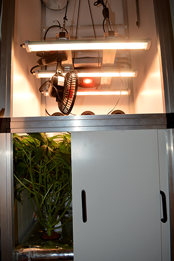 In het nieuwe voedingswater zit Mills A en B en heeft Mills Start-R plaatsgemaakt voor Mills C4. Ook heb ik Mills Vitalize (2 ml/10L) toegevoegd en Voodoo Juice. Mills A en B is de basisvoeding, C4 verhoogt de concentratie aan fosfor en kalium om toppen te kunnen vormen, en Vitalize zorgt met silicium voor de vitaliteit. Voodoo Juice is het enige product dat niet van Mills is maar van Advanced Nutrients. Het bevat nuttige bacteriën die mijn wortels schoon en vrij van wortelrot houden.