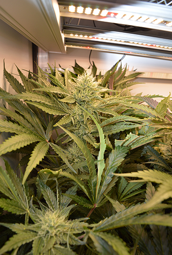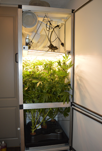 Ik ben heel blij met de ontwikkelingen die de Seriotica’s de laatste tijd doormaken. Ze gaan heel mooi en de trichomenproductie draait op volle toeren. Sommige van de allergrootste bladeren laten zelfs dikke plakkerige harsranden zien, en de fruitige geur is intens en verleidend. Ondanks mijn eerdere knipwerk is de kast echter nog steeds overvol zoals je kunt zien…