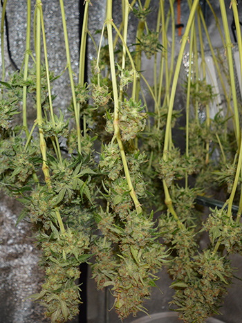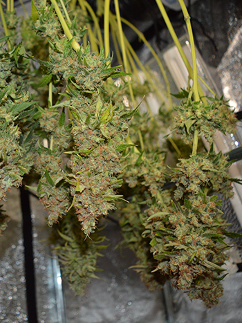 Na zeven weken op 18/6, en nog eens twaalf weken op het bekende 12/12 lichtschema, waren de Lemon Zkittles er wel aan toe. Ze waren ondertussen hoogzwanger en de dunne sativa takken konden het gewicht van de zware toppen geen seconde langer dragen. Tijd voor een bezoek aan dokter eh.. kapper Groen!