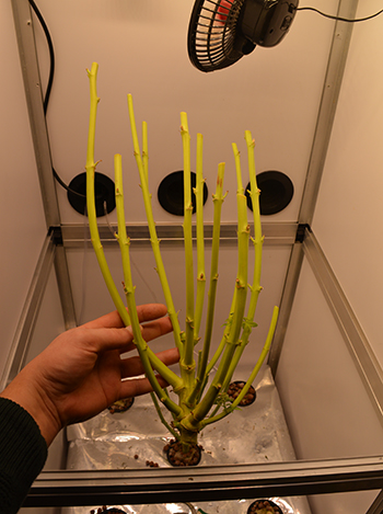 Hoe dit kan weet ik niet maar ik kan wel twee dingen bedenken. Of de plant heeft heel lang in de schaduw gestaan van de andere dames, óf het heeft wat te maken met het gebruik van de Mesolon (apicale celstrekremmer) in het begin van de kweekronde. Hoe dan ook zal ik de Mesolon niet meer gebruiken. Gelukkig heeft het verder geen slechte invloed gehad op de oogst, aangezien de vier andere Mohammed wietplanten de kast helemaal opvulden.